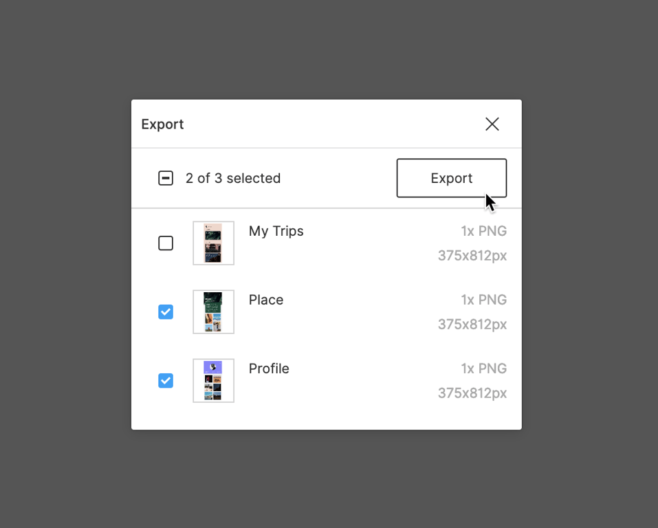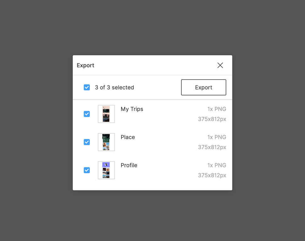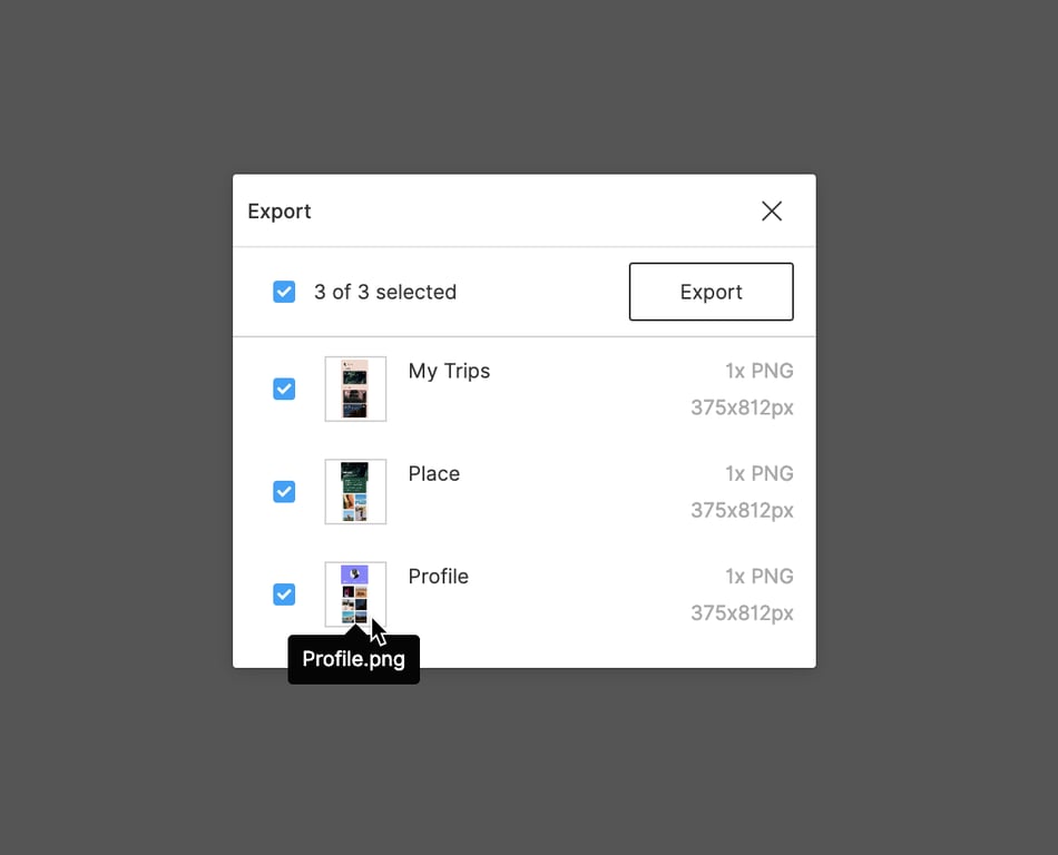 如果文件中有多个页面(pages),可以在文件中的所有页面上添加导出资源。 它们都将添加到同一个导出列表中,并可以批量导出。