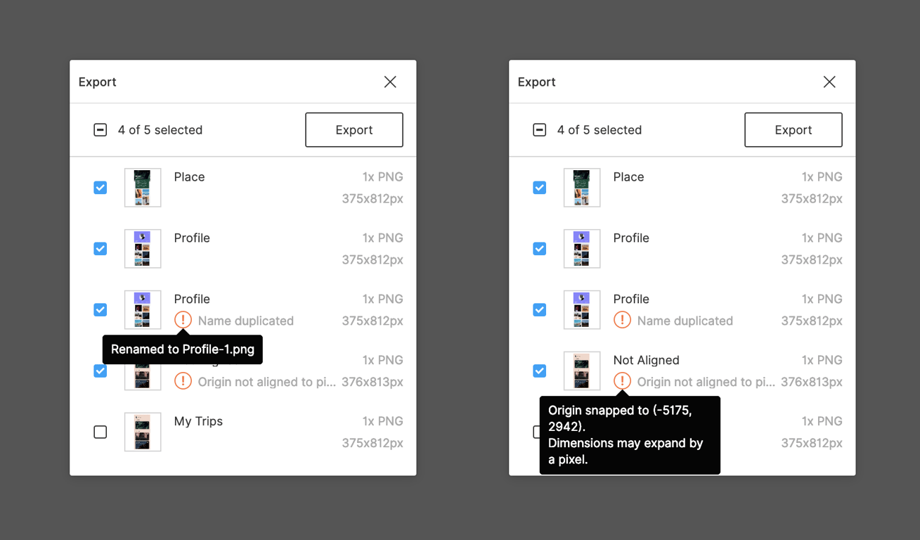 • 名称重复:当导出的文件与导出中的另一个文件名称重复时,将提示此错误。文件名基于图层、组或框架名称,因此你可以修改这些名称以保证文件名唯一。
