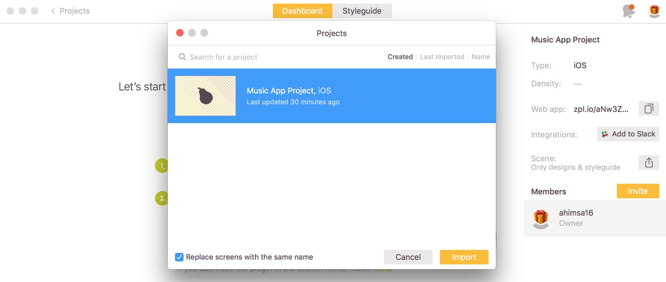 Zeplin 将自动打开,从菜单中选择适当的项目,然后单击 Import