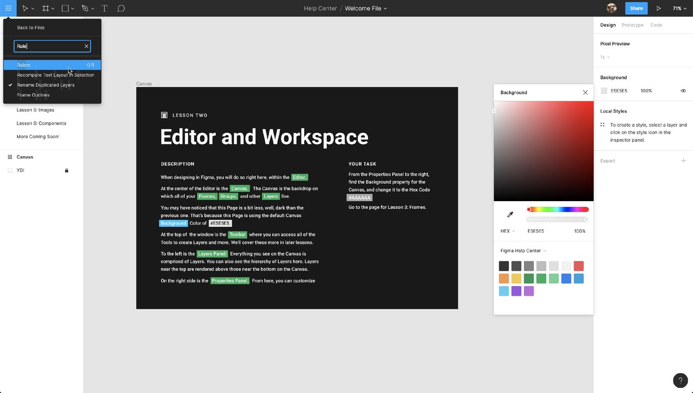 如果你希望在画布上显示标尺,可以使用 Shift + R 快捷键启用。你还可以使用菜单图标下的搜索功能来搜索标尺功能。