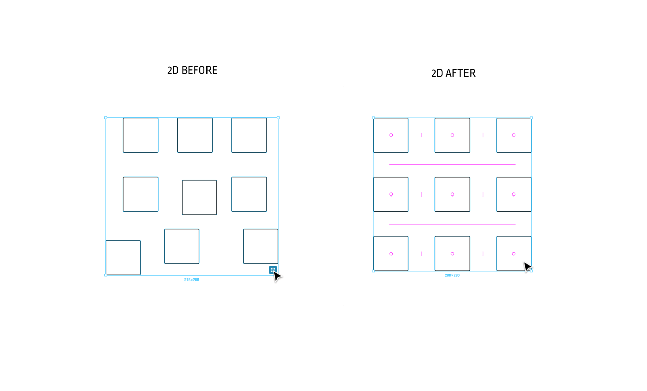 在网格布局(2D)中整理功能要严格得多,对象将调整其垂直和水平间距。