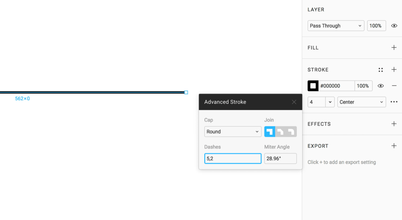 高级选项允许你进一步自定义线条; 包括确定 Cap(线的每一端看起来如何)和 Join(线连接到其他线时的行为),以及使用 Dashes 设置创建虚线。